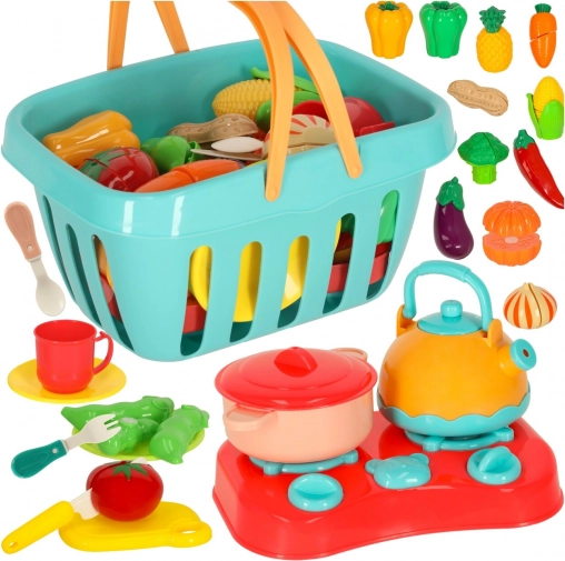 Zaradi velikega števila elementov se lahko otroci igrajo trgovino, kuhinjo in restavracijo. Rezanje, serviranje in kuhanje s čajnikom, loncem in desko za rezanje razvija domišljijo, komunikacijo in podpira uvajanje zdravih prehranskih navad.
