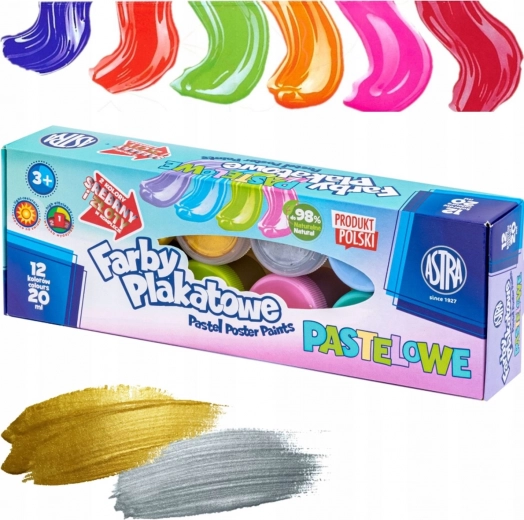 Set 12 pastelnih tempera barv ASTRA po 20 ml. 2 kovinska odtenka, visoka prekrivnost, z vodo redčljive, mat površina. Idealno za otroke.
