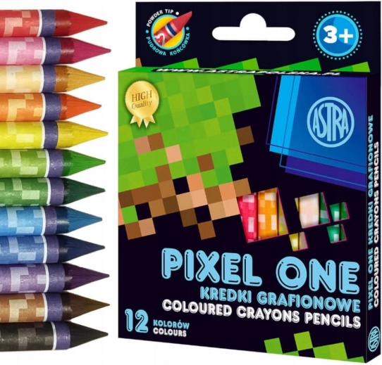 Kaolinske voščenke ASTRA z motivom PIXEL ONE so idealne za risanje, barvanje in pisanje po papirju. Njihovo jedro iz kaolinove gline zagotavlja žive, intenzivne barve in odlično prekrivanje velikih površin, pudrasta konica pa omogoča ustvarjati nežne in mehke prehode. Okrugla oblika nudi udoben oprijem, papirnati ovoj z lepim potiskom v barvi voščenke pa bo navdušil vsakega oboževalca motiva PIXEL ONE.