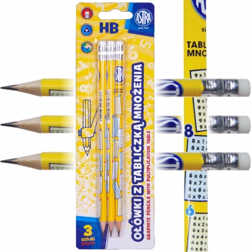 Set treh svinčnikov ASTRA s trdoto HB in praktičnim potiskom poštevanke olajša učenje in pisanje. Ponašajo se z ergonomskim trikotnim ohišjem za udoben prijem, kakovostno mino 2,2 mm ter praktično radirko na koncu. Les izvira iz trajnostno gospodarjenih gozdov.