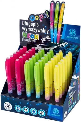 Praktično izbrisljivo pero ASTRA OOPS! s črnilom, ki ga je mogoče izbrisati za brezhibno pisanje. Zahvaljujoč širini sledi 0,6 mm piše gladko in natančno, ohišje iz nedrseče plastike dobro leži v roki, zamenljiv moder vložek pa podaljšuje življenjsko dobo. Neon izvedba v mešanici barv, pakiranje 1 kos.