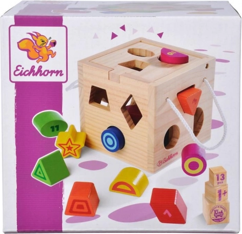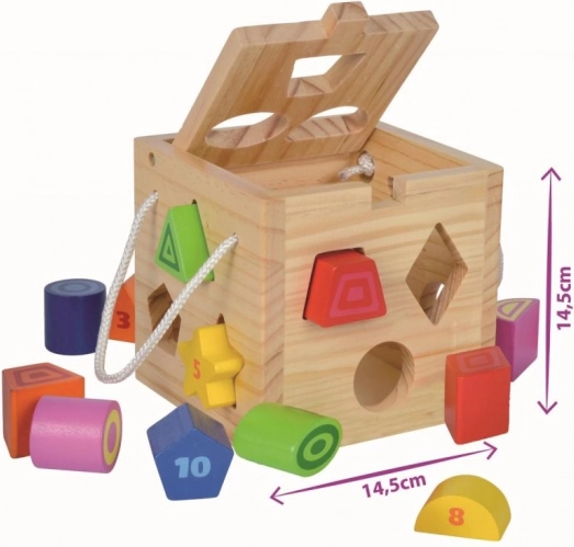 Ta lesena odpirajoča se kocka ponuja klasično igro prepoznavanja oblik. Otroci vstavljajo posamezne dele v pravilne odprtine in urijo koordinacijo oko–roka, logično razmišljanje ter zbranost. Zaradi pisanih barv je učenje naravno zabavno.