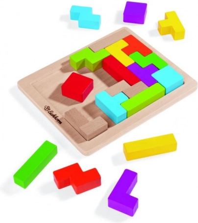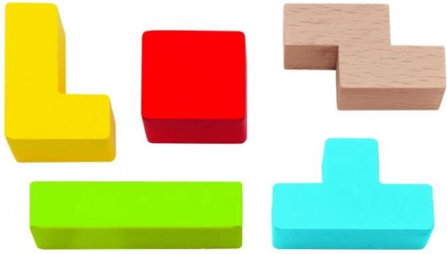 Pametna lesena sestavljanka za 1 igralca spodbuja razvoj fine motorike in logičnega razmišljanja. Vsebuje 20 barvnih kock iz bukovega lesa v 5 različnih oblikah ter trdno ploščo iz vezane plošče z merami 18 × 15 cm za natančno sestavljanje oblik.