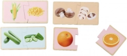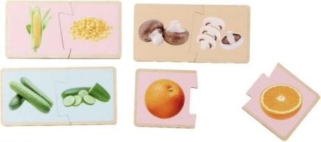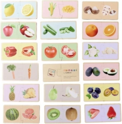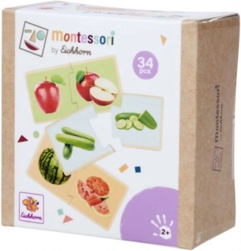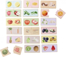 Lesena Montessori sestavljanka s tematiko sadja in zelenjave uči otroke pravilno pariti ujemajoče se kose in poimenovati posamezne vrste živil. Realistične ilustracije pomagajo povezati igro z vsakdanjim življenjem in spodbujajo naravno učenje skozi igro.