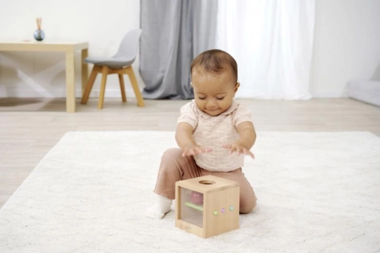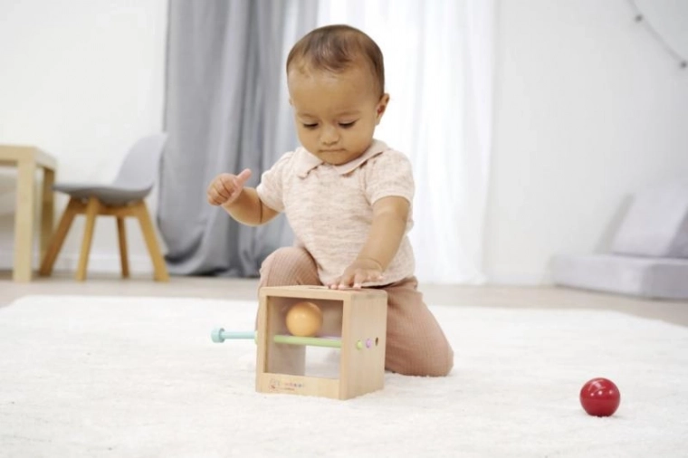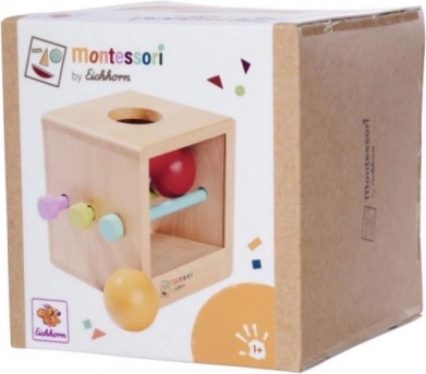 Montessori škatla je vsestranska lesena izobraževalna igrača iz 100% bukovega lesa s certifikatom FSC. Škatla z okencem, 3 palice in 2 barvni krogli omogočajo spremenljivo težavnost – s palicami se krogli v notranjosti ustavita, brez palic pa se takoj zakotalita ven. Spodbuja fino motoriko, koordinacijo oko–roka ter razumevanje vzroka in posledice. Primerno od 1. leta.