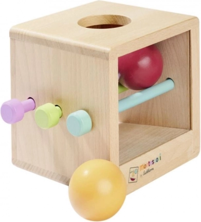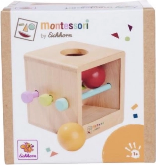 Montessori škatla izhaja iz načel pedagogike Montessori: otrok vrže kroglo v odprtino, opazuje njen gib in se uči zbranosti ter potrpežljivosti. Vstavljene palice začasno ovirajo prehod, zato mali raziskovalci preizkušajo, kaj se zgodi po njihovem odstranjevanju. Brez palic je dejavnost lažja in idealna za mlajše otroke.