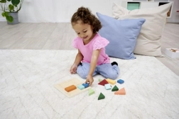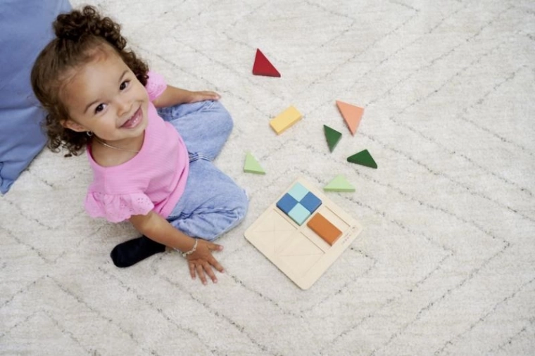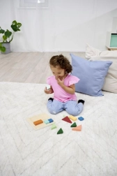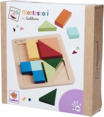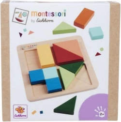Ta montessori sestavljanka otrokom prinaša zabaven izziv: zložiti različne oblike tako, da zapolnijo površino kvadrata. Koščke je mogoče poljubno mešati med kvadrati in ustvarjati nove barvne kombinacije, kar podaljšuje igrivost in spodbuja ustvarjalnost.