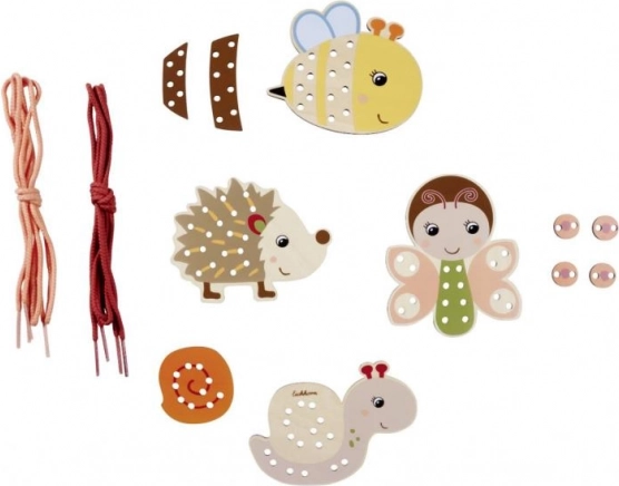 Lesena vezilna set z živalicami za kreativno igro. 4 živalice, vrvice in dodatki, skupaj 15 kosov. Idealno ustvarjanje za otroke.