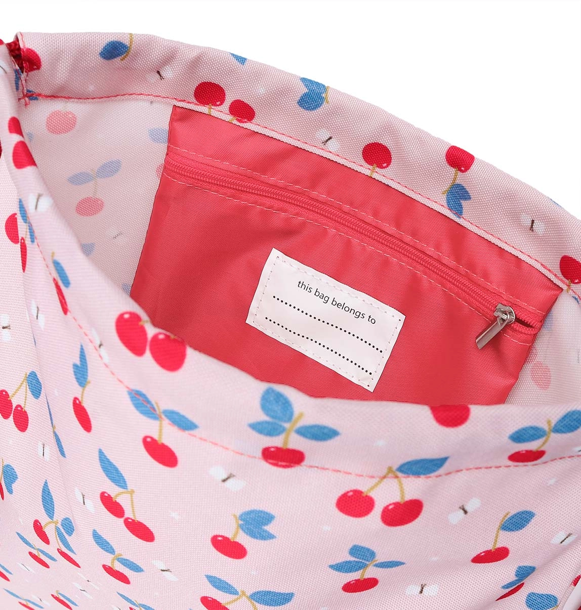 Stilski nahrbtnik-vreča s češnjevim vzorcem bo zanesljiv spremljevalec v šoli, na krožkih in pri plavanju. Je lahek, enostaven za nošenje, otroci pa ga brez napora zategnejo in ponovno odprejo. V notranjosti je praktičen žep na zadrgo za ključe, drobiž ali druge dragocenosti.