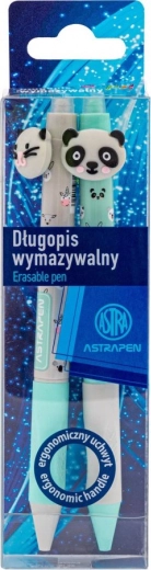 Komplet 2 izbrisljivih peres ASTRA z živalicami. Izbrisljivo črnilo, radirka na koncu in ergonomski oprijem za udobno pisanje brez napak v šoli in pisarni.