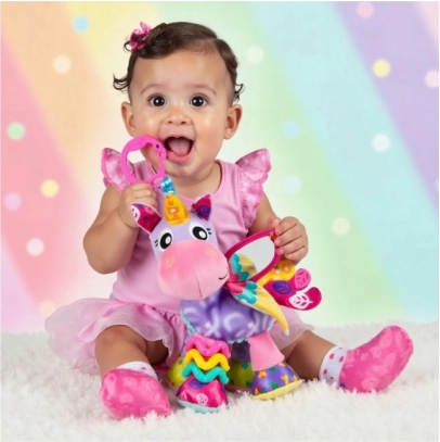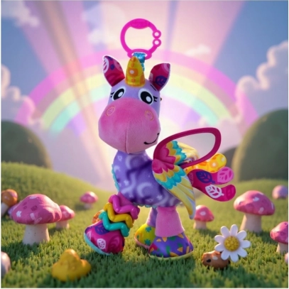 Prisrčni samorog Stella znamke Playgro je mehka viseča igrača za najmlajše, ki spodbuja razvoj čutov in zabava na poti ali doma. Ponuja ogledalce za samoodkrivanje, šušteče in cingljajoče elemente ter različne teksture in kontrastne vzorce za spodbudo vida, tipa in sluha. Zahvaljujoč praktičnemu C sponu jo zlahka pritrdite na voziček, avtosedež ali posteljico.