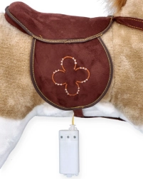 V trebuščku je varno skrit baterijski modul. Po vstavitvi 2× AA (niso priložene) konjiček oddaja zvoke: