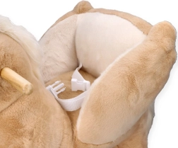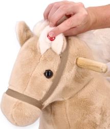 Napajanje zagotavljata dve bateriji AA, ki sta varno shranjeni v žepku pod trebuščkom konjička. Igrača izpolnjuje standarde CE in nudi stabilno konstrukcijo, udoben sedež ter zabavo za dolge ure.