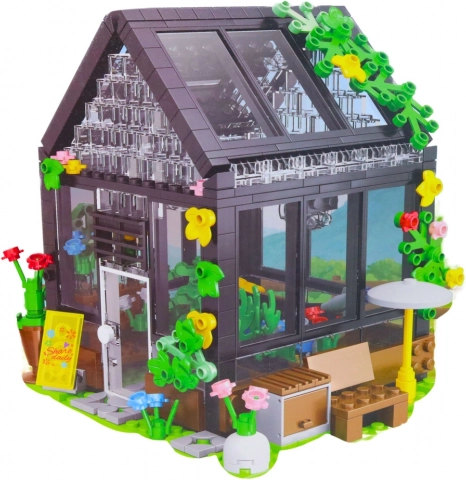 Gradbeni komplet mini rastlinjak s 588 kosi. Prozorna streha, cvetje in vrtna scena. Odlična dekoracija in darilo za otroke od 6 let naprej ter odrasle.