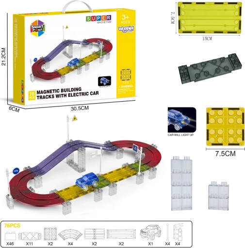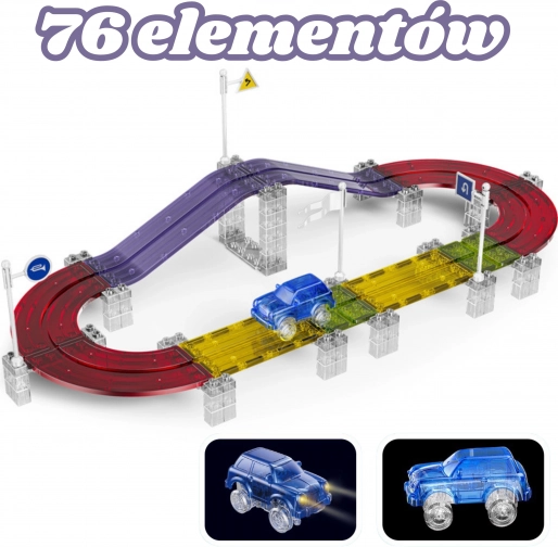 Odkrijte konstrukcijski komplet, ki raste s domišljijo vaših otrok. Magnetni elementi se hitro in trdno pripnejo, kar omogoča ustvarjanje mostov, klančin in ostrih zavojev brez uporabe orodja. Zahvaljujoč LED osvetljenemu avtomobilčku je vožnja privlačna tudi pri ugasnjenih lučeh.