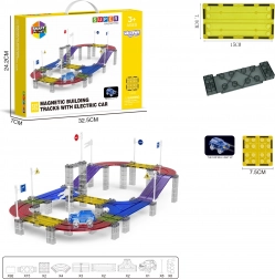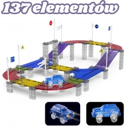 Odkrijte ustvarjalni svet konstrukcijske proge WOOPIE, ki spodbuja domišljijo, ustvarjalnost in logično razmišljanje. Magnetni deli se hitro in trdno pripnejo drug na drugega, zato bodo otroci od 3 let starosti zlahka opravili sestavljanje brez orodja. Barvni prosojni elementi v kombinaciji z LED avtomobilčkom ustvarijo privlačen svetlobni šov.