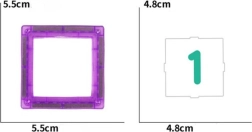 - 8 modrih kvadratov, 7 rdečih kvadratov, 9 sivih kvadratov, 7 vijoličnih kvadratov, 9 zelenih kvadratov, 30 izobraževalnih kartic s številkami