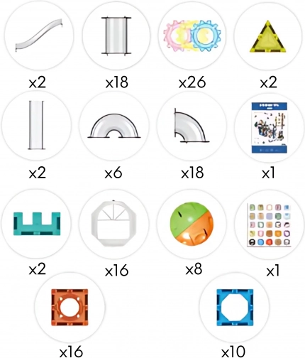 - Prosojni koščki in elementi steze (rampe, zavoji, cevi) za nazorno spremljanje gibanja kroglic.