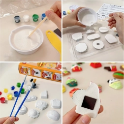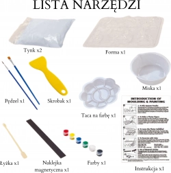 Komplet je zasnovan za otroke od 6 let dalje in vsebuje vse potrebno: kalupe, mavec, barve, čopič ter orodja za mešanje. Pečica ali posebno orodje nista potrebna – zadostuje malo vode in prostor za ustvarjanje.