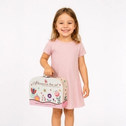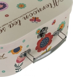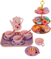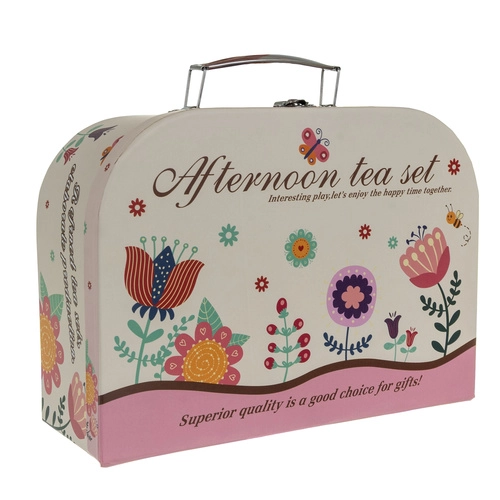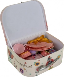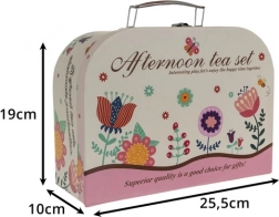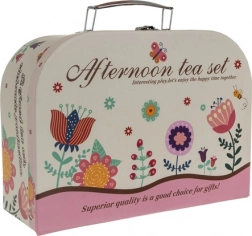 Vsebina paketa: kovček z ročajem in kovinskim zapiranjem, tristopenjsko stojalo za slaščice, čajnik s pokrovčkom, 4 rožnate skodelice, 4 krožnički s cvetličnimi motivi, 4 okrasne žličke, servirni pladenj, 20 slaščic (bonboni, krofi, makroni, piškoti), rjava transportna škatla.