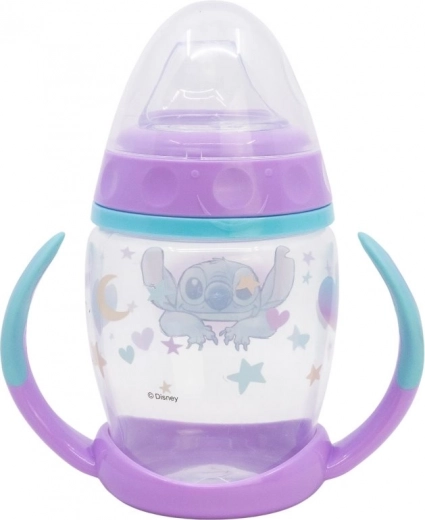 Otroška skodelica STITCH 270 ml z ročaji in mehkim silikonskim ustnikom. Brez BPA, enostavna za držanje in idealna za prve samostojne požirke.