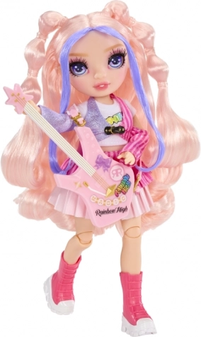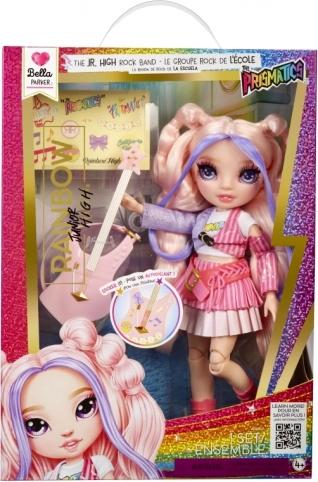 Punčka Rainbow High Junior Bella prinaša ikoničen rožnat videz in glasbeni pridih. Zahvaljujoč gibljivim okončinam jo zlahka nastaviš v epske odrske poze ali vsakdanje prizore. Bella je pripravljena zasijati z bas kitaro in dodatki, ki poudarijo njen edinstven slog.