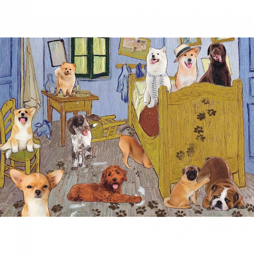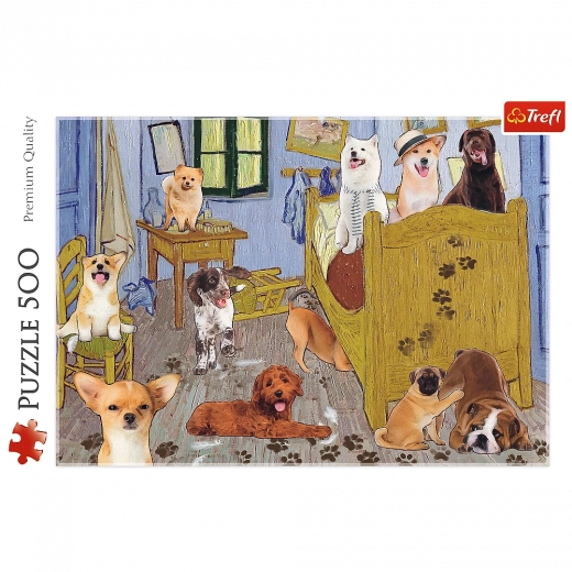 Sestavljanka Trefl 500 kosov – Soba VAN GOGHA: Pasja revolucija. Kakovostna izdelava, kalandrirana površina proti bleščanju, dimenzije 48 × 34 cm. Odlično za ljubitelje psov.
