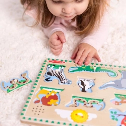 Te kakovostne lesene zvočne sestavljanke prinašajo veselje in znanje. Ko košček namestite na pravo mesto, se oglasi ustrezen zvok, na primer avto ali žival, kar podpira razumevanje vzročnosti in spodbuja otroke k nadaljnjemu raziskovanju.
