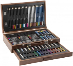 Vsebina kompleta je sestavljena tako, da pokrije celoten spekter likovnih potreb – od risbe do akrila in akvarela. Z lahkoto boste preizkusili suhe in mokre tehnike, plastenje in mešanje odtenkov. Zaradi praktične embalaže je komplet primeren za doma, v šoli in na poti.