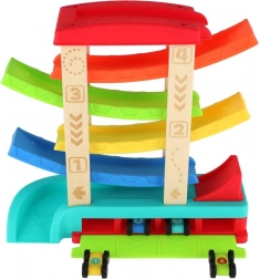 Dovolj je, da eno od 4 priloženih avtomobilčkov postavite na start in opazujete, kako zaradi gravitacije zaporedoma prevozi posamezne nivoje do cilja. Dimenzije 33 × 32 × 10 cm so idealne za igro na mizi ali na tleh, pri čemer zaobljeni robovi in stabilna osnova zagotavljajo varnost.