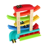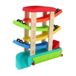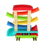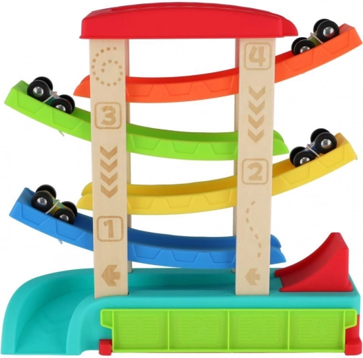 Ta kaskadna dirkalna steza združuje trdne lesene stebre in vzdržljive plastične rampe v živahnih barvah, ki spodbujajo otroško radovednost in vizualno zaznavo. Otroci razvijajo fino motoriko, koordinacijo oko–roka ter razumevanje vzroka in posledice med opazovanjem vožnje avtomobilčkov.