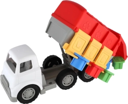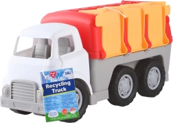 Ta barvit smetarski tovornjak bo navdušil male ljubitelje pospravljanja in recikliranja. Zgornji del služi kot vstavljanka oblik z odprtinami, v katere otroci ujemajo prave koščke in se tako učijo prepoznavati oblike in barve. Stranska odpirajoča se vratca in odstranljivi koši omogočajo zabavno posnemanje zbiranja odpadkov.
