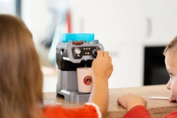 Rezervoar za vodo in funkcija pretoka omogočata, da otroci s pritiskom na gumb pripravijo »kavo« v lonček – tako kot v pravi kavarni.