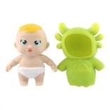 Ta antistresna stiskalna igrača v obliki dojenčka v živalskem kostumu ponuja pomirjujoč otipni občutek in hkrati odlično zabavo. Prožen silikon je prijeten za držanje, prenese pogosto stiskanje in se vedno zanesljivo vrne v prvotno obliko.