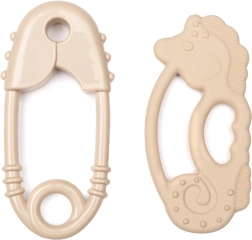 Praktičen komplet za udobno izraščanje zob: mehko silikonsko grizalo v obliki morskega konjička in sponka za pripenjanje na oblačila, voziček ali avtosedež. Izdelano iz živilsko varnega silikona brez BPA, ftalatov in PVC, prijazno do otroških dlesni in enostavno za čiščenje s toplo vodo. Vijolično‑bež dizajn podpira razvoj čutov in fine motorike.