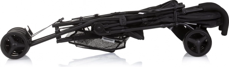 Za varnost skrbijo 5-točkovni pasovi z mehkim oblazinjenjem in povezana zadnja zavora. Udobni ročaji, prevlečeni s kakovostnim materialom, lepo ležijo v roki, prostoren shranjevalni koš pa nudi prostor za nakupe in otroške potrebščine.