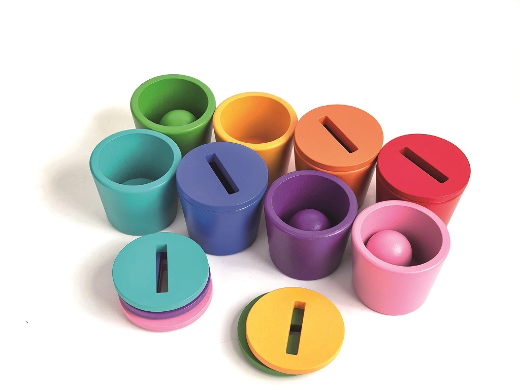 Ta leseni montessori set otrokom ponuja igrivo učenje – razvrščanje kroglic in »kovancev« v barvne lončke, vstavljanje skozi reže ter rokovanje z različnimi orodji. Podpira fino motoriko, taktilno občutljivost in vizualno zaznavanje, hkrati pa uči barve in osnovna načela razvrščanja.