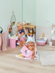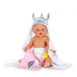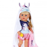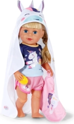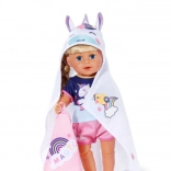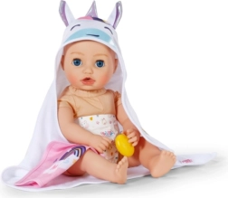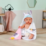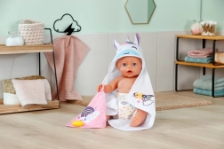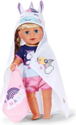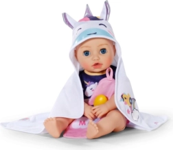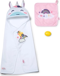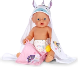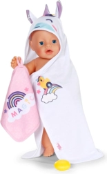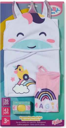Privoščite svoji punčki največje udobje po kopanju s tem prikupnim kompletom brisač BABY born. Vsebuje dva mehka kosa z motivom samoroga in mavrice, kapuco s potiskom in ušeski. Idealno za punčke velikosti 36 cm in 43 cm. Mehak material, čaroben motiv samoroga in praktična kapuca za stilno sušenje in igro.