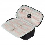 V notranjosti boste našli dvojni izklopni zavih z gumijastimi držali za svinčnike in peresa, praktičen notranji žep na zadrgo za drobnarije in okence za urnik. Zanesljive zadrge YKK in čvrst, recikliran material zagotavljajo dolgo življenjsko dobo tudi ob pogosti uporabi.