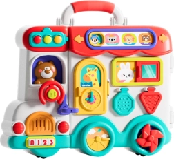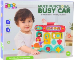 Interaktivni avto »Busy Car« združuje izobraževalni panel, sortirnik oblik, mali klavirček in gibljive elemente, ki otroke spodbujajo k odkrivanju sveta barv, oblik, svetlobe in zvokov. Otroci lahko pritiskajo svetleča gumba, odpirajo vratca, vrtijo koleščka, premikajo elemente in tako razvijajo koordinacijo oko–roka, fino motoriko in domišljijo.