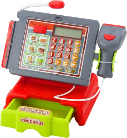 Otroška blagajna z dodatki je odlična izobraževalna igrača, ki verodostojno posnema pravo delo v trgovini. Zahvaljujoč svetlobnim in zvočnim učinkom, čitalniku in mikrofonu je igra privlačna in realistična. Del kompleta so nakupovalna košarica, igrače-denar (bankovci, kovanci) in živila (sadje, zelenjava, embalaže), tako da lahko otroci takoj začnejo »prodajati«.