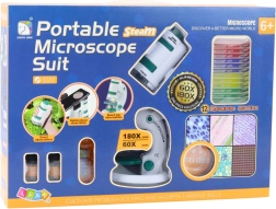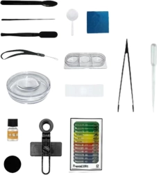 - Mini mikroskop, nastavljiv stativ z LED, pašček za roko, lupa, držalo za telefon, 2× vialka za vzorce, trojni inkubator s stekelci, posodica za preparat s stekelcem, pipeta, nožek, lopatka, paličica, pinceta, 12 pripravljenih preparatov, 4 prazna stekelca, barvito pakiranje