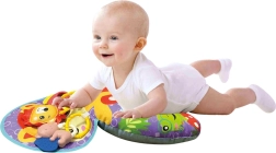 Del kompleta je šumeča podloga z motivom lisice, ki ob dotiku oddaja zvok, ter tri barvne obešanke, ki jih je mogoče pripeti za razvoj koordinacije roka–oko in fine motorike. Celota združuje funkcijo igrače, izobraževalne podloge in udobne opore za varno vadbo.