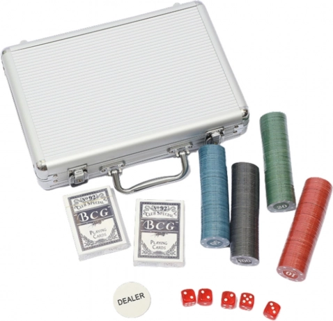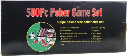 Profesionalni pokerset 500 kosov v aluminijastem kovčku. Žetoni 11,5 g, 2 kompleta kart in 5 kock. Idealno za poker in blackjack doma.