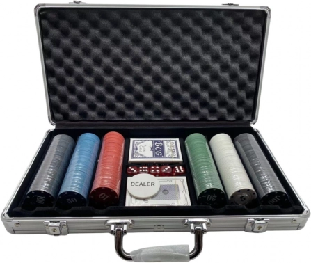 Popoln pokerset s 500 kosi za domače turnirje in družabne večere. Kakovni žetoni 11,5 g s premerom 40 mm, 2 kompleta kart in 5 kock v čvrstem aluminijastem kovčku za udobno shranjevanje in prenašanje – občutek kot v pravem kazinoju.