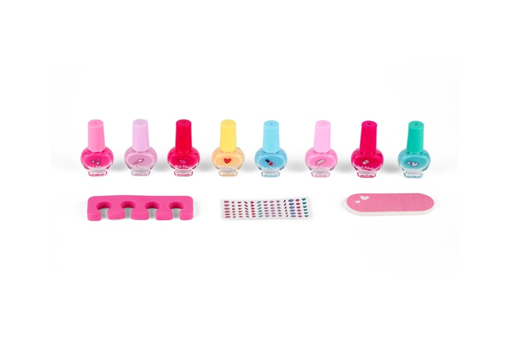 Vsebina kompleta vključuje praktične pripomočke za pripravo nohtov (pilice, ščetka) ter orodja za kreativno aplikacijo (čopiči različnih velikosti, aplikatorji). Z večbarvnimi dekoracijami boste videz zlahka uskladili z oblačili ali sezono ter nohtom dodali bleščeč učinek.