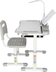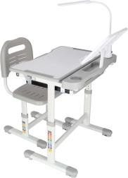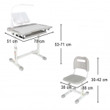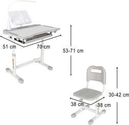 Praktična otroška pisalna miza s stolom in USB LED svetilko v sivi barvi ustvari ergonomski in urejen prostor za učenje in ustvarjanje. Višino mize in stola je mogoče tekoče prilagoditi rasti otroka, na voljo so nagibna delovna plošča, velik predal z organizatorjem, držalo za torbo, mesto za lonček in stojalo za knjigo. LED svetilka ponuja 3 načine svetlobe in 3 ravni svetilnosti za pravilno osvetlitev podnevi in ponoči.