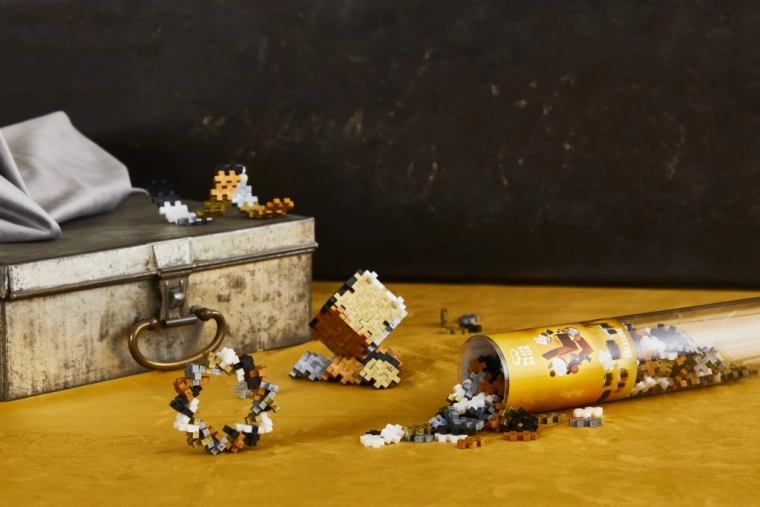 Set Plus-Plus Zaklad prinaša 100 originalnih koščkov v barvah zlata, srebrna, bakrena, črna in biserna. Edinstvena oblika koščkov omogoča enostavno sestavljanje 2D mozaikov in 3D modelov – od preprostih idej do dovršenih konstrukcij. Praktična tuba je odlična za na pot, v vrtec ali domov.