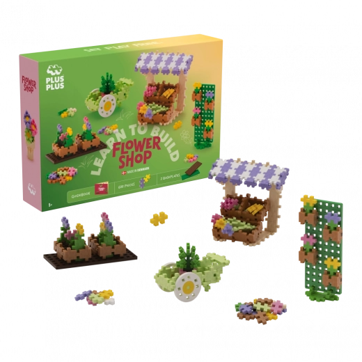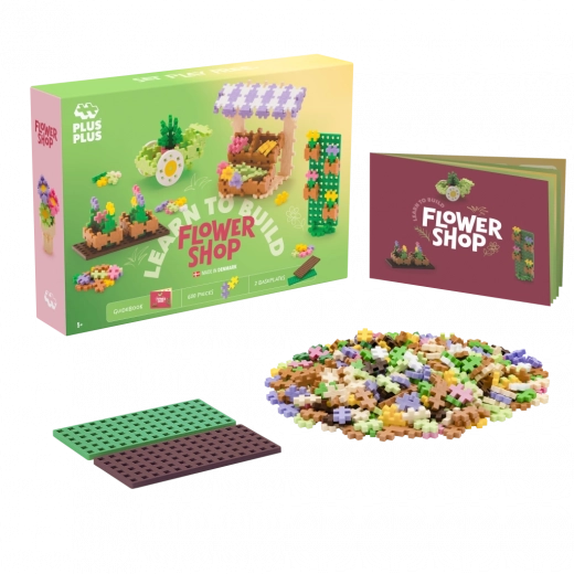 Odkrijte ustvarjalni gradbeni set Plus-Plus Nauči se graditi Cvetličarstvo s 600 pisano obarvanimi kosi in dvema podlagama. S pomočjo knjižice z navodili preprosto zgradite stojnico, voziček ali cvetlične aranžmaje – in po domišljiji še karkoli drugega. Izdelano na Danskem iz reciklirane plastike, brez ftalatov in z enostavnim vzdrževanjem. Primerno od 5 let.