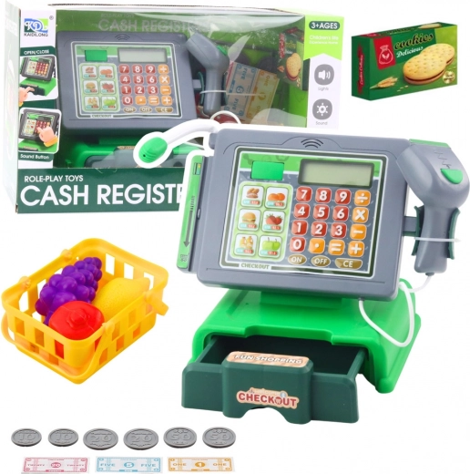 Zabavna in izobraževalna otroška blagajna z dodatki prinaša realistično igro trgovine. Vsebuje svetlobne in zvočne učinke, skener, mikrofon in številčnico. Priloženi so bankovci in kovanci, nakupovalna košara ter živila za še pristnejšo izkušnjo.